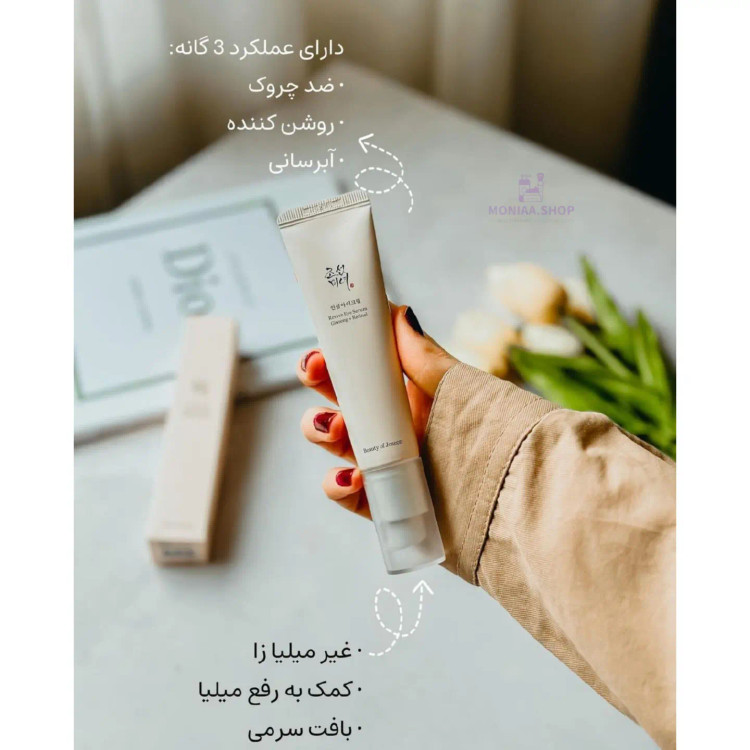 این سرم دور چشم، یک سرم چشمی غنی از مواد موثر جهت جوانسازی و افزایش الاستیسیته پوستی است که از چندین مواد بسیار موثر در پروسه جوانسازی بدون آسیب به پوست استفاده شده است،این محصول که با ترکیب عصاره جینسینگ و رتینال به بهبود چین و چروک روی پوست حساس اطراف چشم کمک می کند. جنسینگ جز ترکیبات اصلی و اولیه این محصول است زیرا مطالعات متعددی وجود دارد که نشان میدهد جینسینگ به دلیل داشتن مقادیر فراوان ساپونین در بهبود چین و چروکها موثر است. جینسینگ یک ماده گیاهی شناخته شده با اثربخشی عالی است. مواد اصلی عصاره ریشه جینسینگ 10% در Donguibogam، یک کتاب پزشکی گیاهی کره ای، جینسینگ به عنوان یک داروی مهم شرقی استفاده می شد و به عنوان "Shincho" به معنای گیاهی از خدایان ثبت شده است.